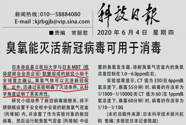 6月4日,中央主流新闻媒体《科技日报》刊登重磅报道:臭氧能灭活新冠病毒可用于消毒。报道主要内容如下:日本奈良县立医科大学与日本MBT(感染症部会会员企业)联盟组成的研究小组于全球首 次确认,臭氧气体可以灭活新冠病毒。此外,还通过实验明确了灭活条件,从科学角度证明了其实用性。