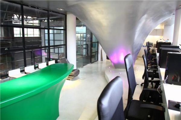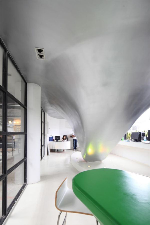在较低的楼层,各个工作站沿着窗户放置。绿色雕塑桌可用于公共活动。中央楼梯既非正式又有轮廓,让人想起准备从天花板上掉下来的大水滴。进入楼梯后,明亮的红色高度饱和的环境吞没并围绕着个体,鲜明地标志着对比办公室区域之间的过渡。颜色在第二层重复出现,以突出凹进的工作区域。