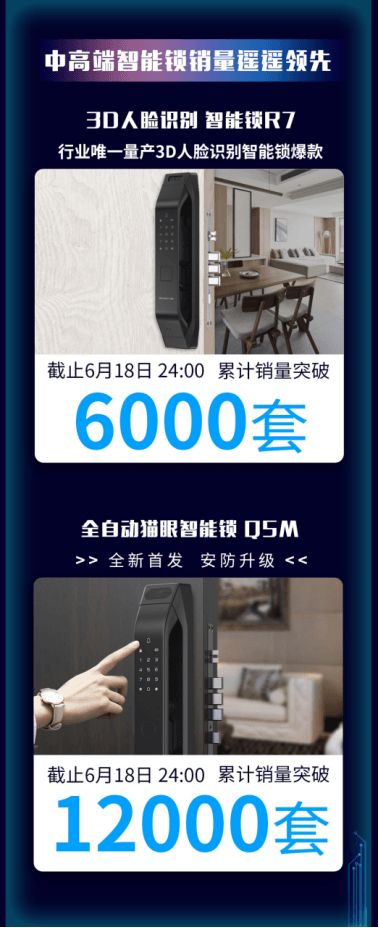 在新品表现方面,德施曼近期重磅推出的新品全自动猫眼智能锁Q5M,初次上线发售,就登上了天猫单品销量榜第一的位置,累计销售突破12000套,成为最受消费者关注的人气单品之一。