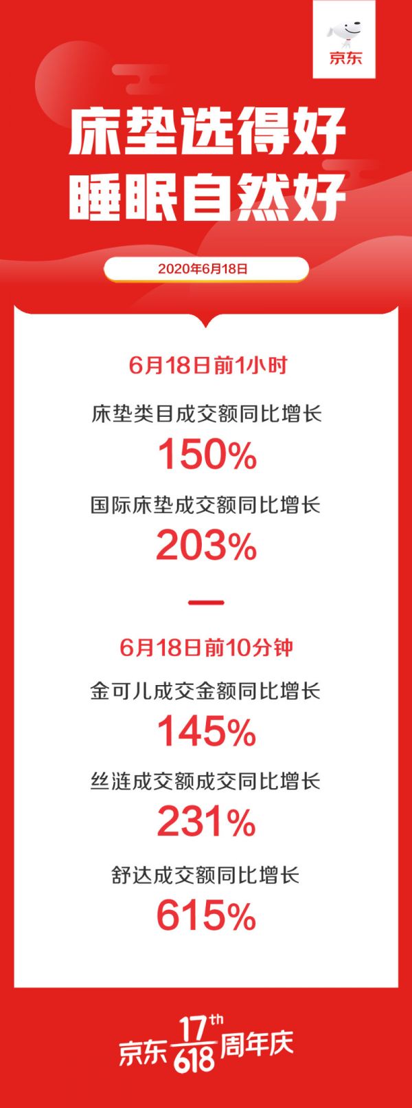 对于高度关乎睡眠质量的床垫,消费者也更加精挑细选。乳胶床垫因其透气性好、防螨抑菌、柔软贴身的特性成为畅销爆品。6月18日,乳胶床垫成交额同比增长400%;6月18日前10分钟,国际大牌床垫集体爆发,金可儿成交额同比增长145%,丝涟成交额同比增长231%,舒达成交额同比增长615%。