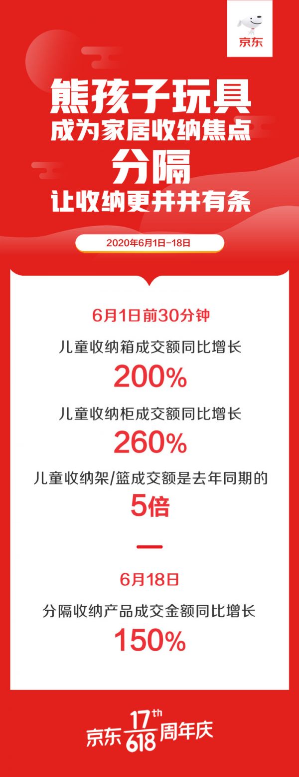 疫情宅家期间同样锻炼了收纳的好习惯,熊孩子的玩具成为收纳焦点。6月1日前30分钟,儿童收纳箱成交额同比增长200%,儿童收纳柜成交额同比增长260%,儿童收纳架/篮成交额是去年同期的5倍;618期间,分隔收纳成交额同比增长150%,合理收纳让生活变得更井井有条。