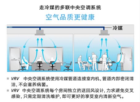 这是一款疫情期间也可安全开启的中央空调系统——冷媒管连接/独立送回风,不存在房间之间的空气交换,力求降低不同办公室群体交叉感染的可能性。