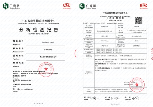 经广东省微生物分析检测中心对欧神诺抗菌砖进行急性经口毒性、急性眼刺激以及一次皮肤刺激实验,证明欧神诺抗菌砖安全无刺激、无毒性,是健康、安全的产品。