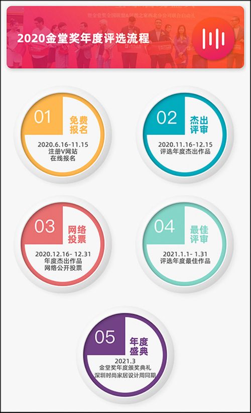 根据规则,2020金堂奖将在2020年6月16日-11月15日进行设计师的报名参评;经过组委会认真评选后,于12月16日发布年度杰出作品获奖名单,同时开始网络公示和为期一个月的在线投票;在2021年三月(初定)将正式举办年度颁奖盛典,并公布年度最佳获奖名单。
