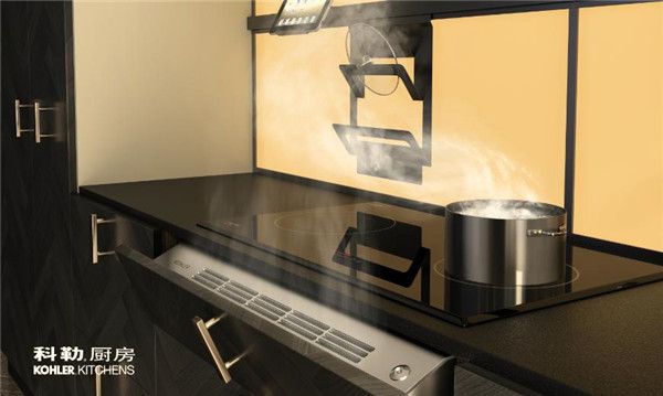人性化操作是科勒厨房设计的重中之重。中式烹饪离不开煎炒烹炸,油烟热气使很多人颇为抗拒。诺谛系列厨房在灶台前暗藏了一个隐藏功能——风帘抽柜,做饭时可以用风帘吹散喷向面孔的热气和油烟,避免不适的同时也输送着清凉,大大提升厨房操作的舒适度。