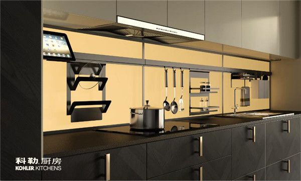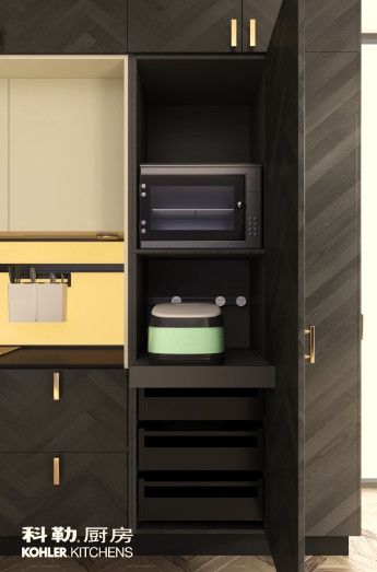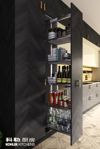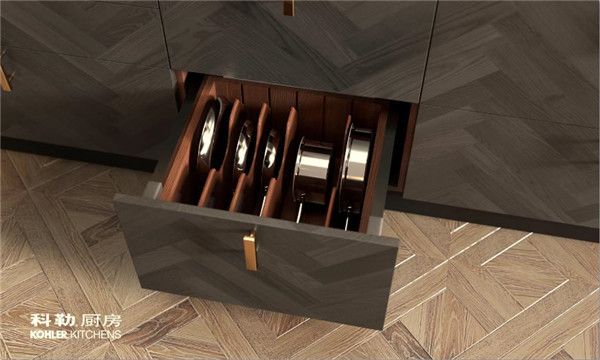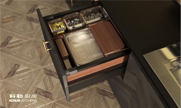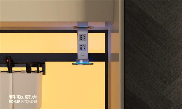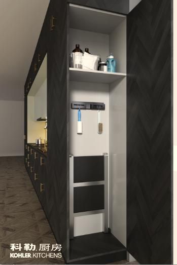 现代厨房中有越来越多的小家电及杂物,很难收纳,也容易产生用电安全隐患。科勒厨房诺谛系列高效利用空间,展现了智慧的厨房用电及收纳规划。隐藏门高柜根据厨房实际使用需求,可将柜内分为内抽层、小家电收纳层、电器层及开放层。小家电收纳层标配一组电力轨道和两个LED适配器,关门时具有整体美观性,开门时各种小家电操作方便,根据厨房实际使用需求而设计实用的收纳空间,一目了然的规划提升空间利用又不失便利,进一步提升优雅操作的厨房环境。清洁用品收纳柜,完美收纳各种厨房清洁用品,改善杂物无处可藏的窘迫。隐藏式一体冰箱柜及双抽水槽柜的设计,将实用功能不留痕迹地隐藏起来,避免因杂乱而打破整体厨房的设计格调。