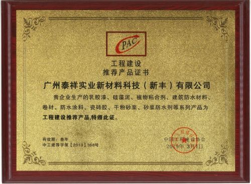 作为业内较早获得ISO9001和ISO14001认证的企业之一,泰祥玉建以推广绿色家装理念为使命,先后为广州塔、琶洲国际会议中心、广州大学城等大型市政工程提供了系统防水解决方案,并荣获“国家高新技术企业”、“国家质量检测优质建材单位”等荣誉称号,成为雅居乐集团、恒大集团、珠江实业集团等优秀地产企业的合作伙伴。