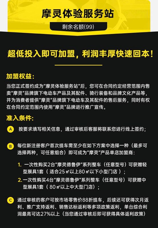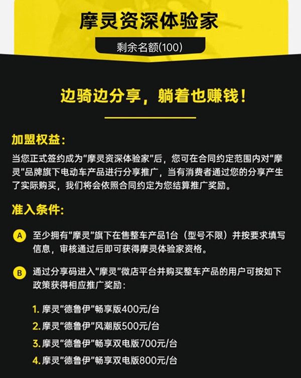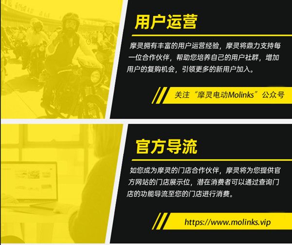 为了提供更容易盈利的优质商业机会,也为消费者带来更加好用的产品,摩灵电动于2020年6月18日,开展“百万合伙人计划”,正式向全国开放合作渠道加盟。只需一次加盟,就可以拥有摩灵电动旗下所有产品的代理权。