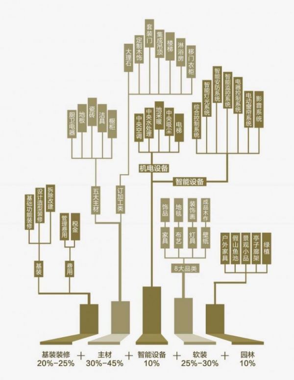 因为很多不正规的装修公司会在报价时故意漏项、错项,先忽悠业主签合同,然后再在装修过程中不断加码,把错项漏项额外补回来。 这就是为什么装修预算总是超支的根节所在。那么如何避免掉入报价单的陷阱里呢?上海星杰认为业主们首先需要明确装修报价单内容构成,就拿上海星杰的全案装修报价单为例,上海星杰的报价单一般会分为5个大的板块:基础装修、主材 、软装、智能设备、园林。具体费用分配情况可看下图。