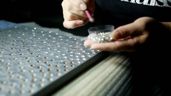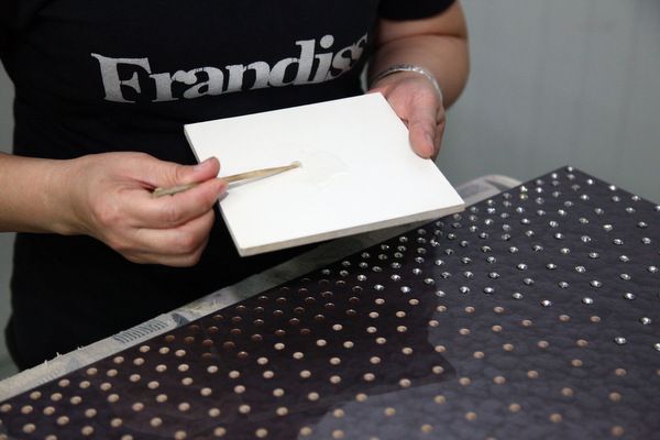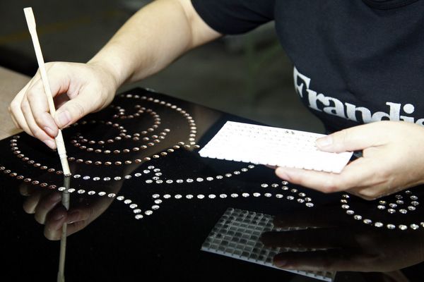 每次完成水晶镶嵌后,都要进行全面检查清理。镶嵌师会从不同角度仔细检查镶嵌板,防止出现水晶漏贴,贴歪或者没贴稳的现象出现。