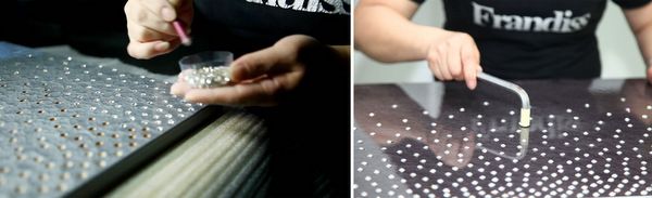 所有工序有条不紊地进行,一颗颗的水晶被陆续镶进木板中,绮丽的图案慢慢显露,闪烁出璀璨夺目的光芒,宛若夜空中的星河。Frandiss水晶镶嵌师就像古典小说中描述的“星星的捕获者”一样,他们捕获了天空中最亮的星星,让家具增添古老而又神秘的色彩,为人们留住那些浪漫美妙的时光。