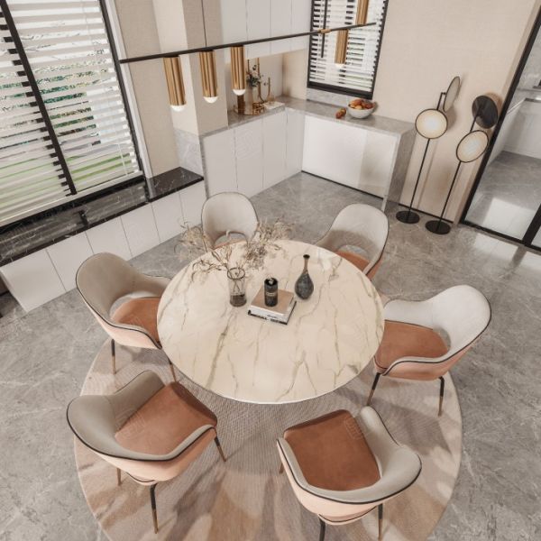餐厅也延续了客厅的主色调,精致的摆件与温暖的色调,体现了星杰装修的设计师对这个空间的喜爱。餐桌下的圆形地毯,让这个空间有了聚焦点,空间的层次感在细节上处理的恰如其分。灰白相间的大理石的地面,与莫兰迪色系的就餐区相辉映,让空间更加优雅矜贵。