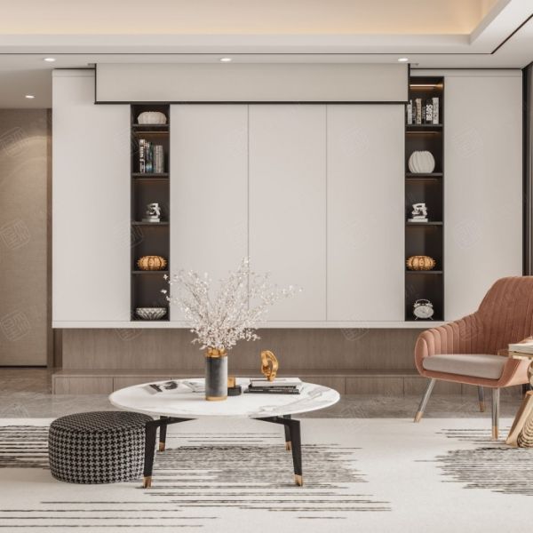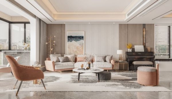 聚焦客厅,处处都是细节的处理。带有弧度的沙发、圆形的茶几,让空间变得柔和,布艺材质的沙发与地毯为空间增加蓬松的慵懒感。客厅背景墙所挂的装饰画也选择了迎合整个空间色调的抽象画作,丰富了空间内容。除此之外,星杰装修的设计师特意在沙发后的角落放上了金色的摆件,显得格外精致。