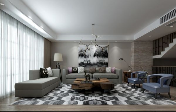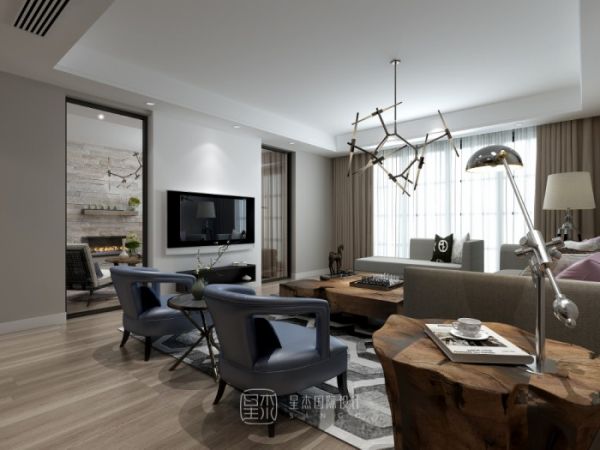 为避免地下室的阴暗潮湿,影音室采用了瓷砖地板,楼上空间的地板则都采用了木质地板,更有贴近大自然的感觉。客厅的吊灯设计采用简洁的线条,茶几和沙发旁边的小桌子用的是边缘烤漆的木头,原生态中又有现代工艺气质。