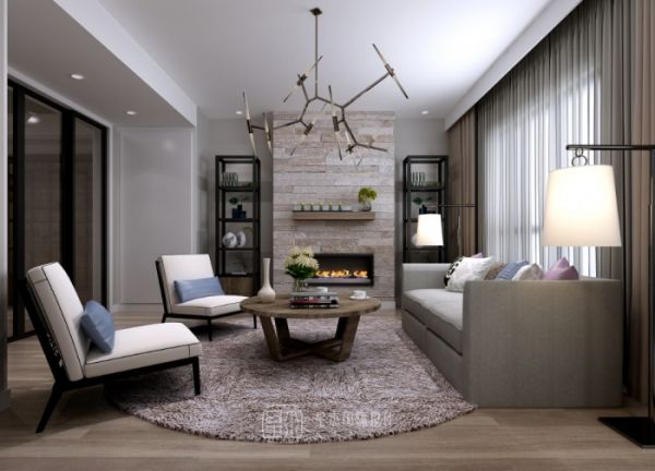 起居室比客厅略小,温暖的羊毛地毯,朴实的木质茶几,造型简洁的灯具互相搭配,给人干净素雅的感觉,让家时刻散发着温暖。米白棉麻质感的布艺沙发与地板的原木色搭配,构筑成空间自然质朴的专属格调。
