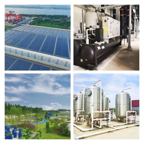 ▲从左到右、从上到下依次为李锦记新会生产基地的光伏发电系统、地源热泵系统、人工湿地公园、中水回用系统