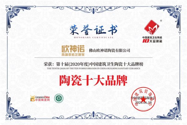 重磅喜讯!欧神诺斩获2020“陶瓷十大品牌”称号