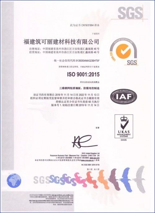 夯实产品质量,提升管理水平,福建筑可丽建材科技有限公司生产管理体系顺利通过全球领先的认证机构SGS的审核,SGS的审核专家组一致认为筑可丽三维钢网轻质墙板、防裂布的设计、生产、设备及质量体系符合ISO9001:2015质量管理体系标准且运行有效,并于2019年11月20日正式颁发ISO9001:2015质量管理体系认证证书。