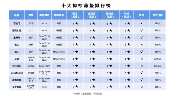 从综合来看,排名前三的分别为:喜临门-伊菲、源氏木语-J11、金海马-安梦,三款椰棕薄垫,从销量、硬度、支撑度、透气性等在10款产品中脱颖而出,受到广大消费者的青睐!