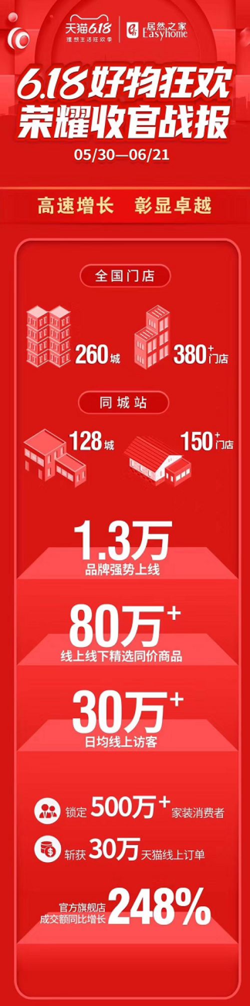 618活动正式结束,对于居然之家来说,收获的日子刚刚到来。经过了近一个月的努力,居然之家在618年中大促期间共有线下260座城市、380家店铺、线上128个城市同城站、150家门店参与,锁定500万+家装消费者,斩获天猫线上订单超30万单,天猫官方旗舰店成交额同比增长248%,这是居然之家在探索“直播+同城站”新模式下的自我突破。