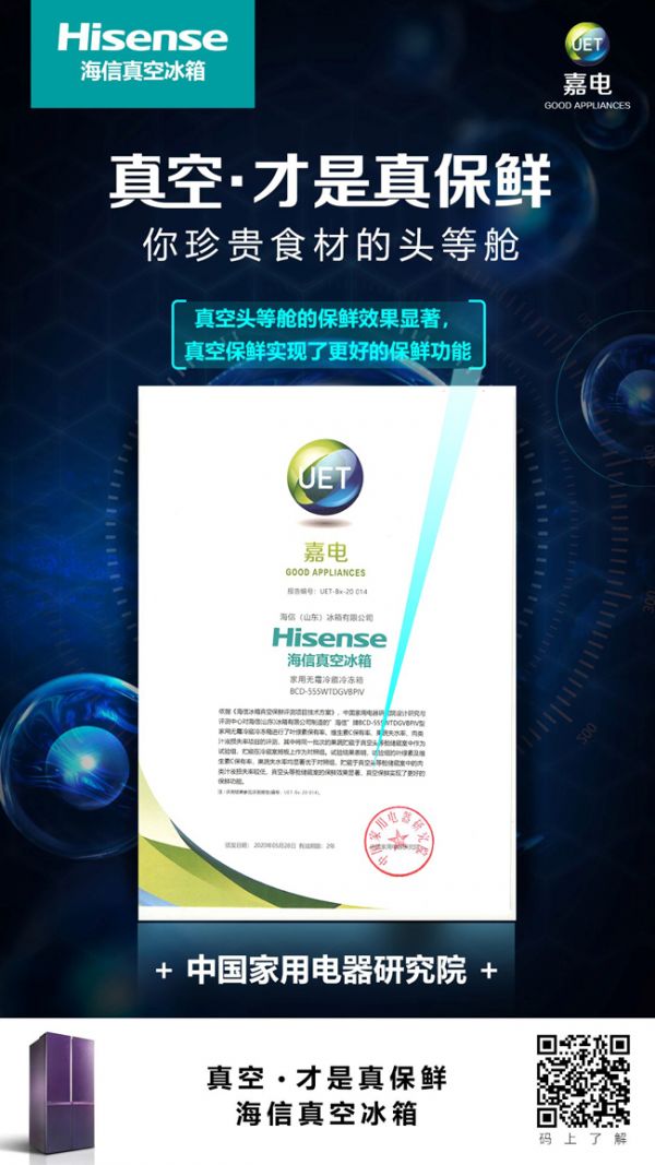 近日,中国家用电器研究院设计研究与评测中心对海信真空冰箱进行了评测,测评结果显示“真空头等舱的保鲜效果显著,真空保鲜实现了更好的保鲜功能。”