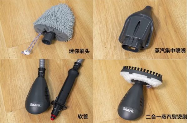 可以清晰的看到鲨客蒸汽拖把P8的整体配件,主拖把头有两个(长方形&三角拖把头,其中双面清洁拖把布赠送一块),手持模式下的配件也较为丰富,有迷你刷头、软管、二合一蒸汽熨烫刷以及蒸汽集中喷嘴,适应于全屋的清洁。