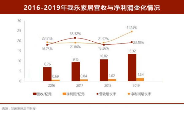 (2016年-2019年我乐家居营收与净利润变化情况)