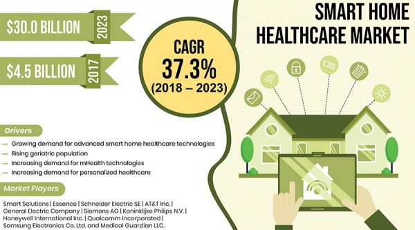 据市场调研机构Cole Market Research预计,智能家居医疗保健市场将从2017年的45亿美元增长到2023年的300亿美元,在2018-2023年(预测期)的复合年增长率为37.3%。