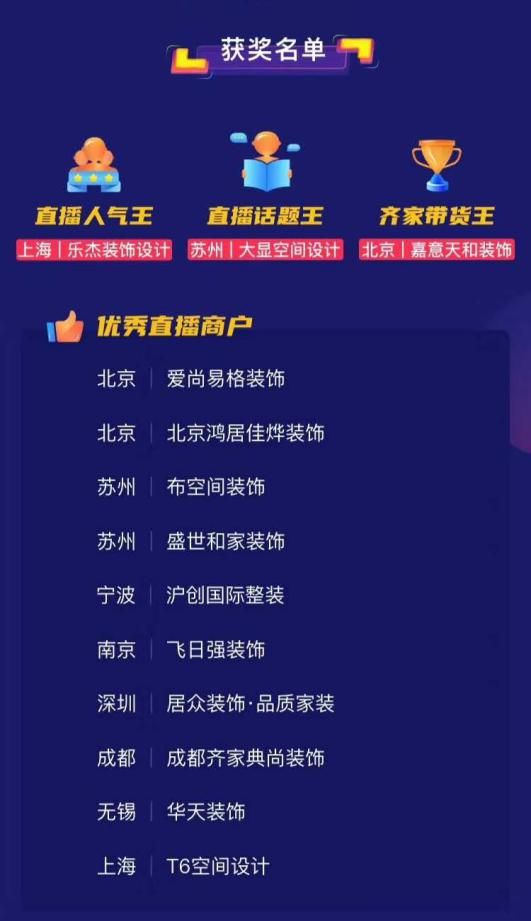 经过三天直播比拼,13家装企设计师在此次大赛中脱颖而出,分别摘得“直播人气王”、“直播话题王”、“直播带货王”和“优秀直播商户”的直播大奖,奖项也将上线直播设计师和装修公司的介绍主页成为专属荣誉标签。