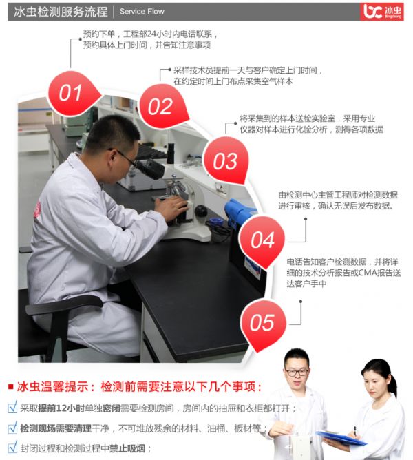 浙大冰虫检测技术人员上门采集空气样本,然后送至专业实验室化验分析测得各项数据,2-3个工作日出具技术分析报告;另外冰虫送检的专业实验室具备CMA资质,可提供CMA检测报告(主要用于大型工程的验收)。