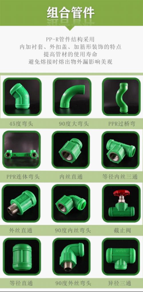 PP-R管件结构采用内加衬套、外扣盖、加强筋形装饰的特点,提高管材的使用寿命,避免熔接时熔出物外漏影响美观。