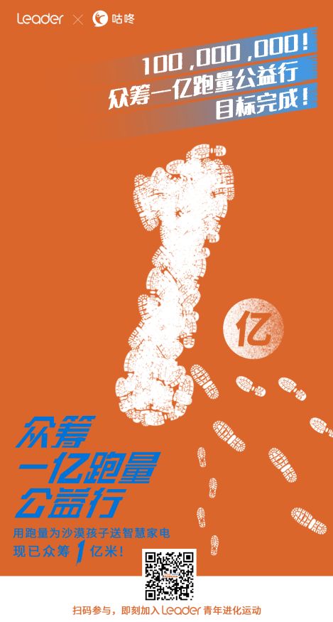 6月25日,Leader联合咕咚发起的“青年进化运动”活动圆满收官,Leader众筹一亿跑量为沙漠孩子送家电。活动结束,跑量累计达1.04657亿米,成功兑现为沙漠地区孩子捐赠Leader健康智慧家电的计划。网友直呼:过瘾!