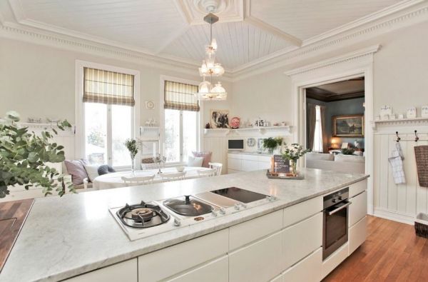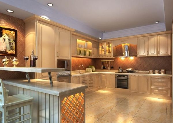 2、现代厨房设计整体较为大方,整个厨房以淡色为主,没有过多的华美装饰,实木橱柜设计,,流利的线条,加上大理石台面,整体会显得非常的整洁干净。