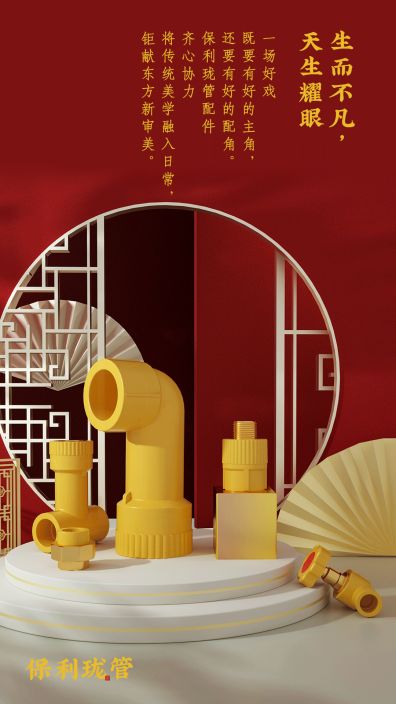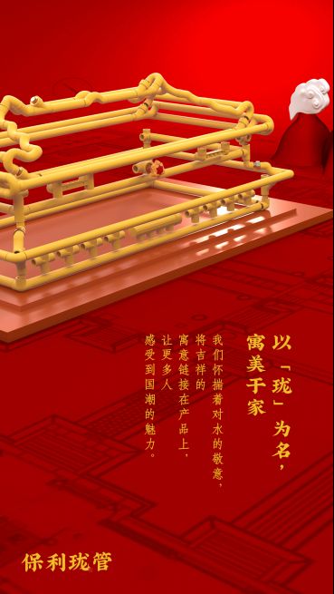 国风的图案,大胆的配色,保利珑管打破人们对水管的固有印象。我们保留品牌蓝色,加入国人最崇尚的黄色,稳重的蓝配以跳跃的黄。