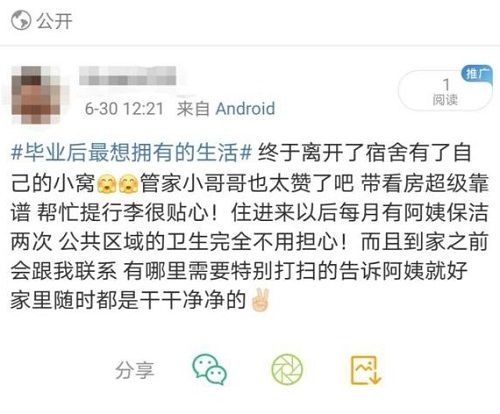 同为应届毕业生的王洋(化名),目前租住在位于东五环的一间次卧。她告诉记者:“每月两次的公共区域保洁,随时上门的维修,‘无所不能’的管家,入住之后才能体深切体会,不仅是方便,更是安心。”自如所提供的精细化生活服务,给租客带来了极大的便利。