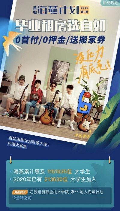 据了解,唐俊和他女朋友毕业后租的第一套房来自自如“海燕计划”,该计划是自如针对应届毕业生推出的社会责任项目。主要特点包括“租金月付、0押金、送搬家券”等。