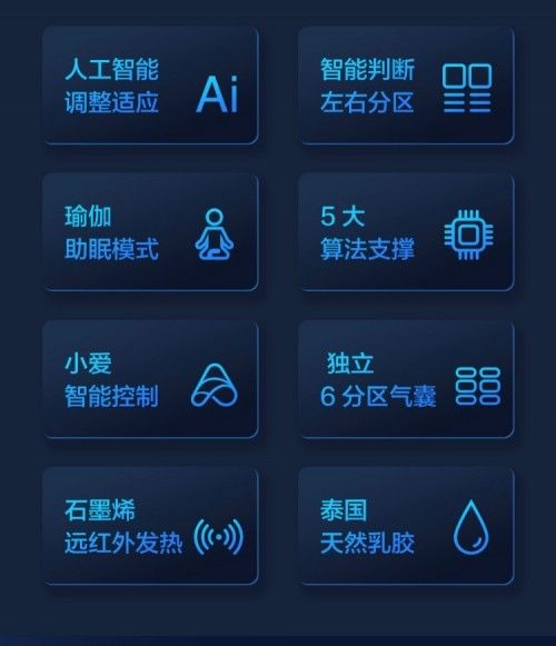 同时具有,5大算法支撑,小爱智能控制,独立6分区气囊,石墨烯远红外发热等功能。具有很强烈的科技感。