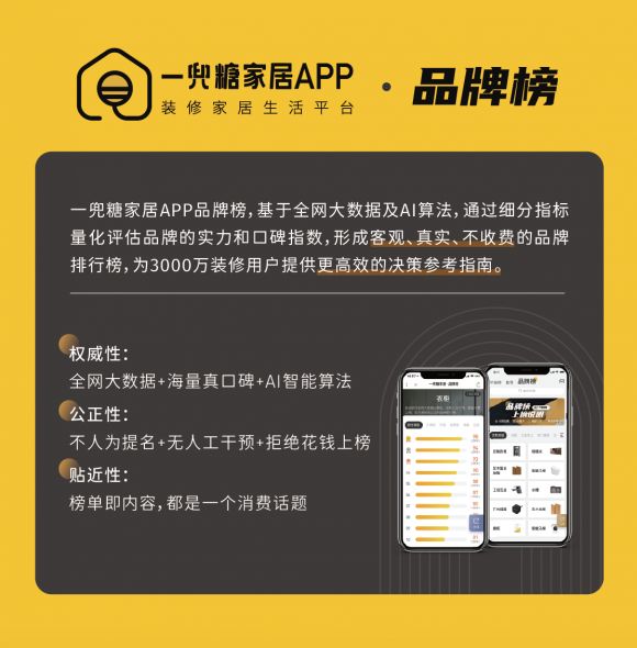 这是一份基于全网大数据、线上口碑及平台用户趋势,借助AI精密算法综合选出的品牌榜单,囊括装修家居生活等消费主流场景,并拒绝人工干预和一切买榜行为,让用户每一次决策能够高效、有品质、物有所值。