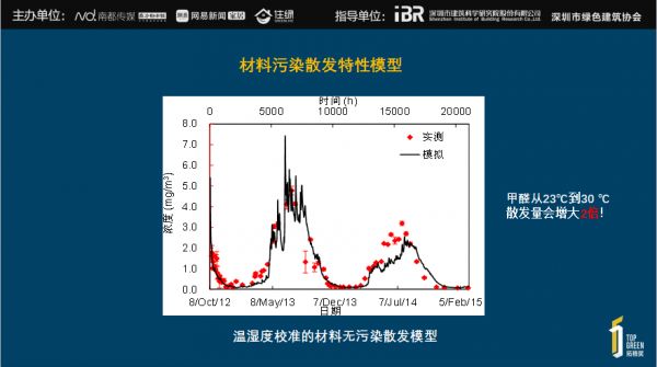 从材料污染散发特性模型来看,材料的污染散发会受到温湿度等外界环境。通过大量实地长期的实验可以看到,温湿度越高,散发的甲醛量越大。另外,行业也达成一个共识,从23度到30度的温度增长,板材的散发会增大大概两倍左右。