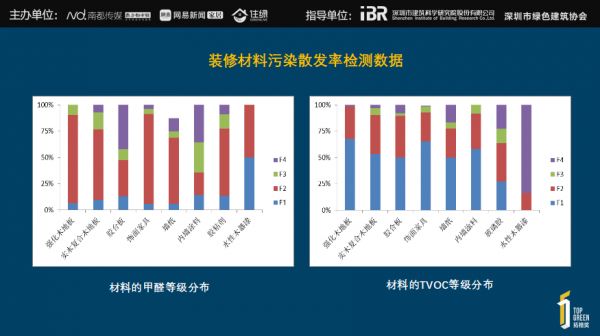 对市面上500种材料进行检测发现,以甲醛为检测物,达到F1、F2的材料比例不低;以TVOC为检测物,达到F1的材料基本上没有。所以,家具的污染占比确实是在整个装修工程中间是比较大的,这部分也是材料商要加强的部分。