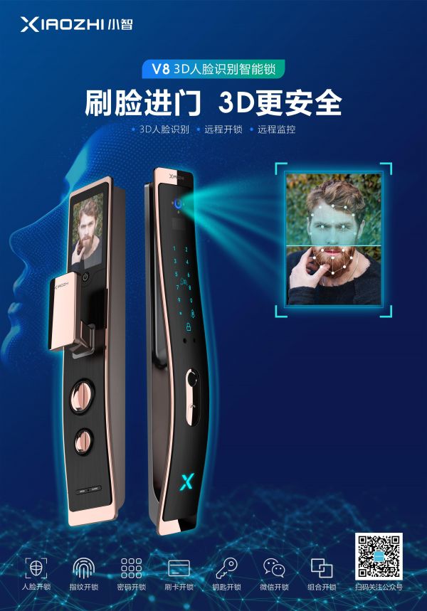 小智智能锁V8采用3D人脸识别技术,完美融合智能猫眼、智能摄像头误识率≤0.0001%。小智智能锁V8高清摄像头监控,门外一览无余,此外,采用红外人体探测,门外存在异常逗留,可实现抓拍报警,全方位呵护居家安全。远程监控、远程开锁的功能更能让业主省心、放心。