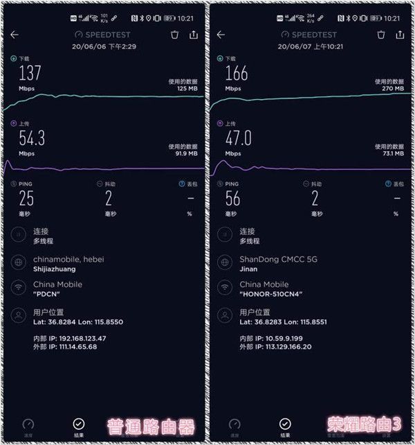 得益于凌霄wifi6芯片的强劲双核,荣耀路由3能够支持1024-QAM和160MHz两大超大频宽的工作模式。在双频并发的情况下,理论连接速率高达2976Mbps(2.4GHz 574Mbps + 5GHz 2401Mbps),将wifi6+速度发挥到极致。以支持wifi6的荣耀30Pro+为例,原来的路由测试网速是下载速率为137Mbps,而在与这款荣耀路由3进行绑定之后,下载速率被大幅度提升至166Mbps。