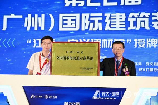 开馆仪式上,中国建筑材料流通协会会长秦占学代表协会授予安义县“全国铝型材流通示范基地”荣誉称号,安义县政府副县长、工业园区党工委书记刘志伟代表安义县接受荣誉。