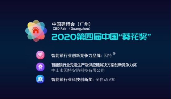 7月8日,2020中国建博会在广州顺利开展,在疫情背景下建材行业共同为行业发展砥砺前行。同期,旨在表彰智能锁行业发展成果的“葵花奖”颁奖盛典隆重举办。经过专业权威的研究院、质检院、产品设计机构、锁匠机构等专家评审,因特一举斩获“2020智能锁行业创新竞争力品牌”、“2020智能锁行业科技创新奖”、“2020智能锁行业先进生产及供应链解决方案创新竞争力奖”三大奖项,在智能锁领域彰显出无可撼动的品牌实力。
