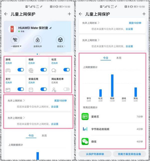 此外,这款荣耀路由3还设置了儿童上网保护功能,这个功能帮助家长有效地规划学生上网时长,并且通过这个功能,还实现了远程的控制与监督。此外,Ta也可以设置网址黑名单,以防孩子进入不健康的网址。此外,我们还能通过这个功能来查看孩子主要访问了哪些APP、网站以及访问时长,便于为家庭营造良好的上网空间。除了这些,荣耀路由3还有安全防火墙,游戏加速保护等功能,让上网更安全,游戏操作更流畅。
