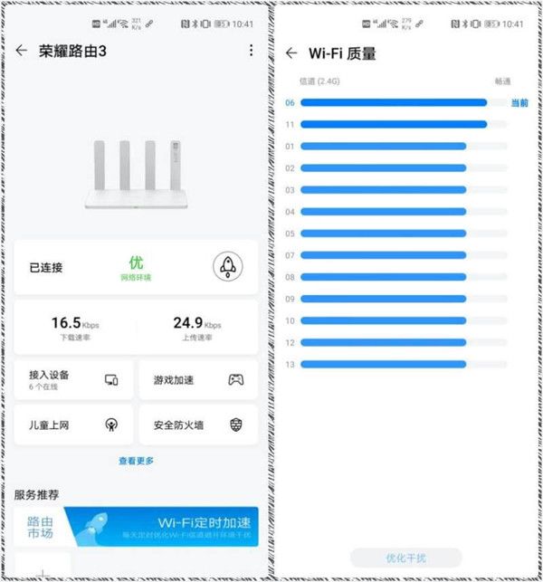 打开这款荣耀路由3的管理设置界面。在管理设置界面上就可以查看网速的下载速率和上传速率,并对其进行等级判别。再点击一下小火箭,就可以查看当前wifi质量。如果遇到判断等级为良或者差的情况下,可以选择优化干扰这个功能,让网速更快更稳定。