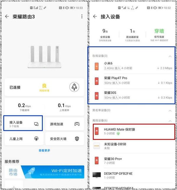 用户还可以点进去接入设备功能,可以详细地看到当前连入路由器的手机类型。值得一提的是,查看接入设备以及设置其他的功能,不一定非得使用荣耀路由3的wifi,只要是有网络的地方,就可以查看荣耀路由3的情况并且设置。