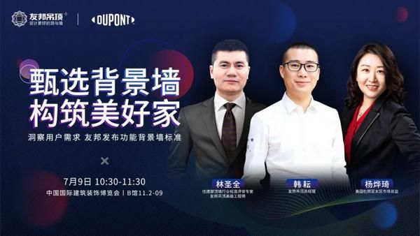 7月9日中国广州建博会友邦吊顶展馆,友邦吊顶总经理韩耘先生,住建部顶墙行业标准评审专家、友邦吊顶高级工程师林圣全先生,美国杜邦亚太区市场总监杨烨琦女士,现场助阵 “甄选背景墙 构筑美好家”——友邦发布功能背景墙标准活动。