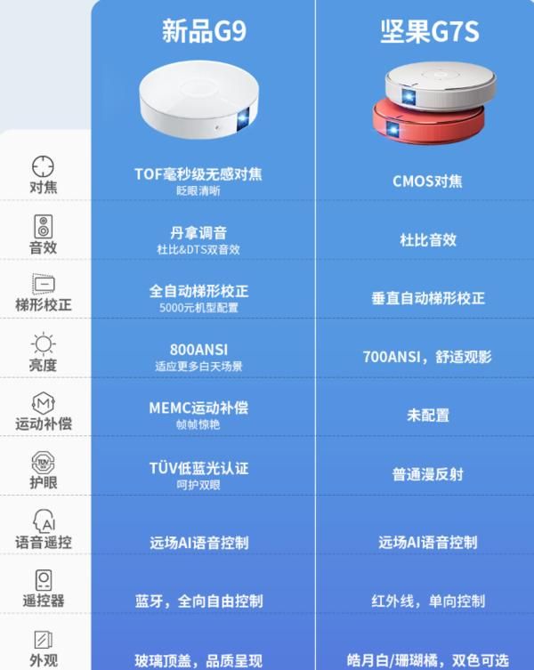相比坚果G7S,这款坚果G9在配置上有很大的提升,首先就是亮度到了800ANSI,同时在硬件上搭载了2+16G内存,并且使用TOF+CMOS无感对焦,还有MEMC运动补偿功能,在功能性上可以说提升了一大截。