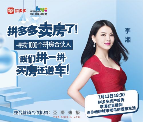 7月13日19:30,著名主持人李湘将空降拼多多直播间,与海雅集团将在线寻找1000个拼房合伙人。值得一提的是,为了解决用户“先买房还是先买车”的烦恼,拼多多还将在“千人团”开团成功后,重磅推出“买房送车”活动,针对不同房型送出指定汽车。如用户不需要汽车,“限时秒杀”团队将在既有补贴的基础上,进一步追加3至8万元的资金补贴。此外,在“买房送车”的基础上,“拼盘”成功后还有限时秒杀5折房源、万元家居大礼包、现金红包大奖等“壕礼”。